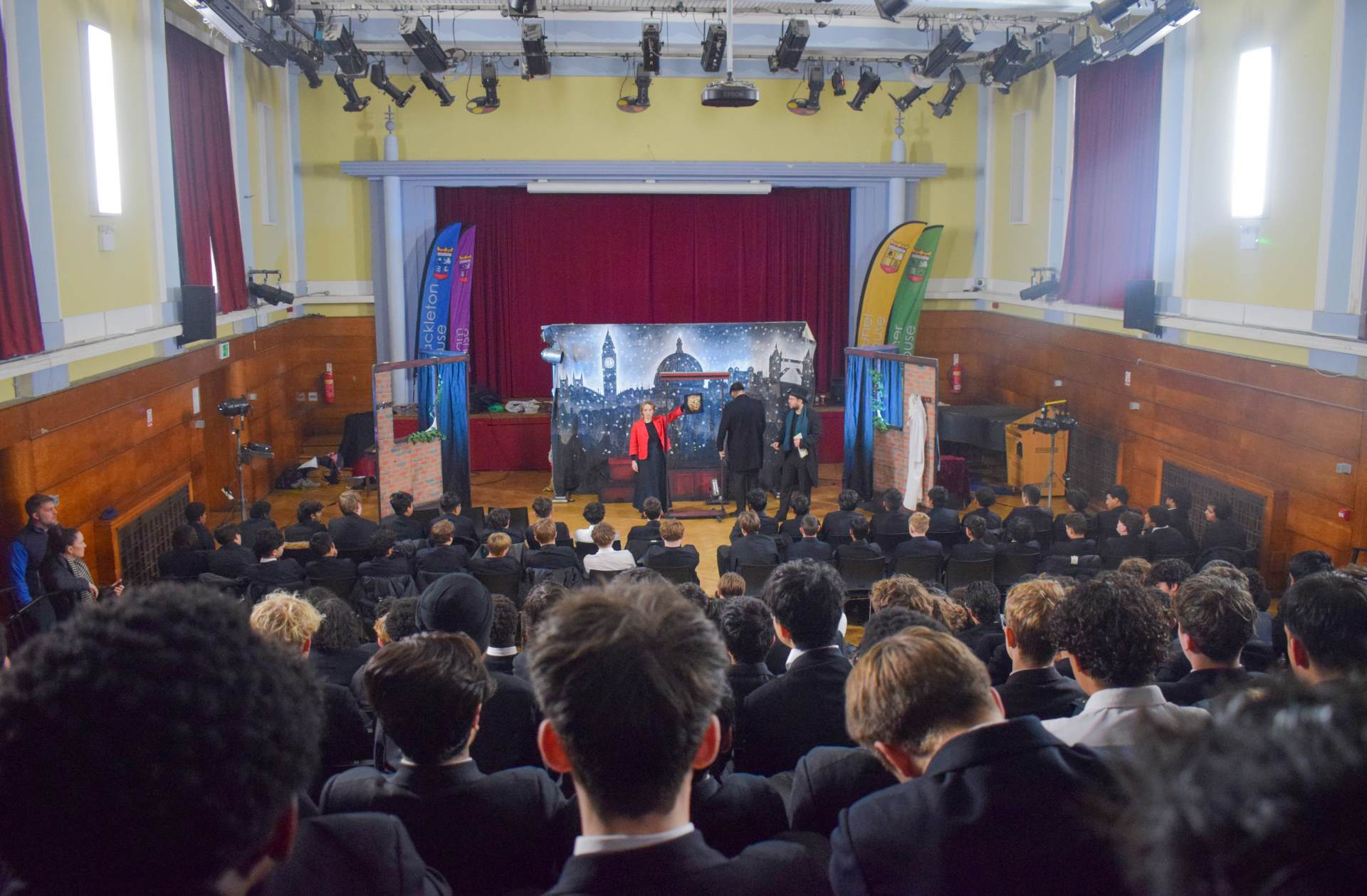 For Year 11, every minute counts in the lead up to their summer examinations – and everyone in school works hard to help every student maximise his knowledge. A great example of this came this week to help the year group prepare for their GCSE English Literature paper 1. One of the set texts in that examination is Charles Dickens’ famous festive novel, ‘A Christmas Carol’. We welcomed Quantum Theatre into school for a very special abridged performance of the text.